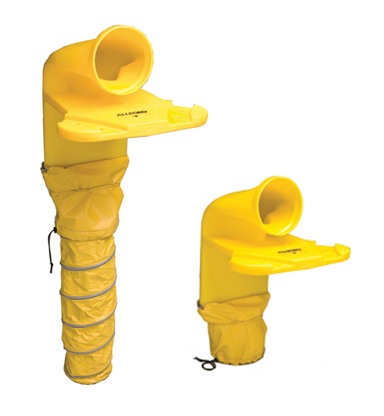 Allegro's MVP is the first manhole system that combines the low profile manhole air vent, 90° elbow and built in mounting all in one unit. This unit comes with a collapsible duct, for easy entry, stored in a small storage bag that can be dropped down into the manhole with a quick release of the drawstring. The Collapsible duct springs back into shape once worker is down into the manhole. The ducting is vinyl and polyester with PVC coating and heat resistant up to 180° F. The manhole cover fits into a flat channel corner for stabilization. Compact, lightweight and made from Linear Low Density Polyethylene (LLDPE), this unit is easy to store and ships in one small carton. Recyclable. Sold by the each.